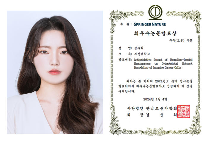 바이오소재과학과 고분자콜로이드실험실(지도교수 서성백)의 석사과정 정수희 학생이 4월 3~5일까지 제주국제컨벤션센터에서 개최된 2024 한국고분자학회 춘계학술대회에서 구두(토론) 부문 최우수논문발표상을 수상하였다.