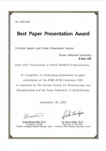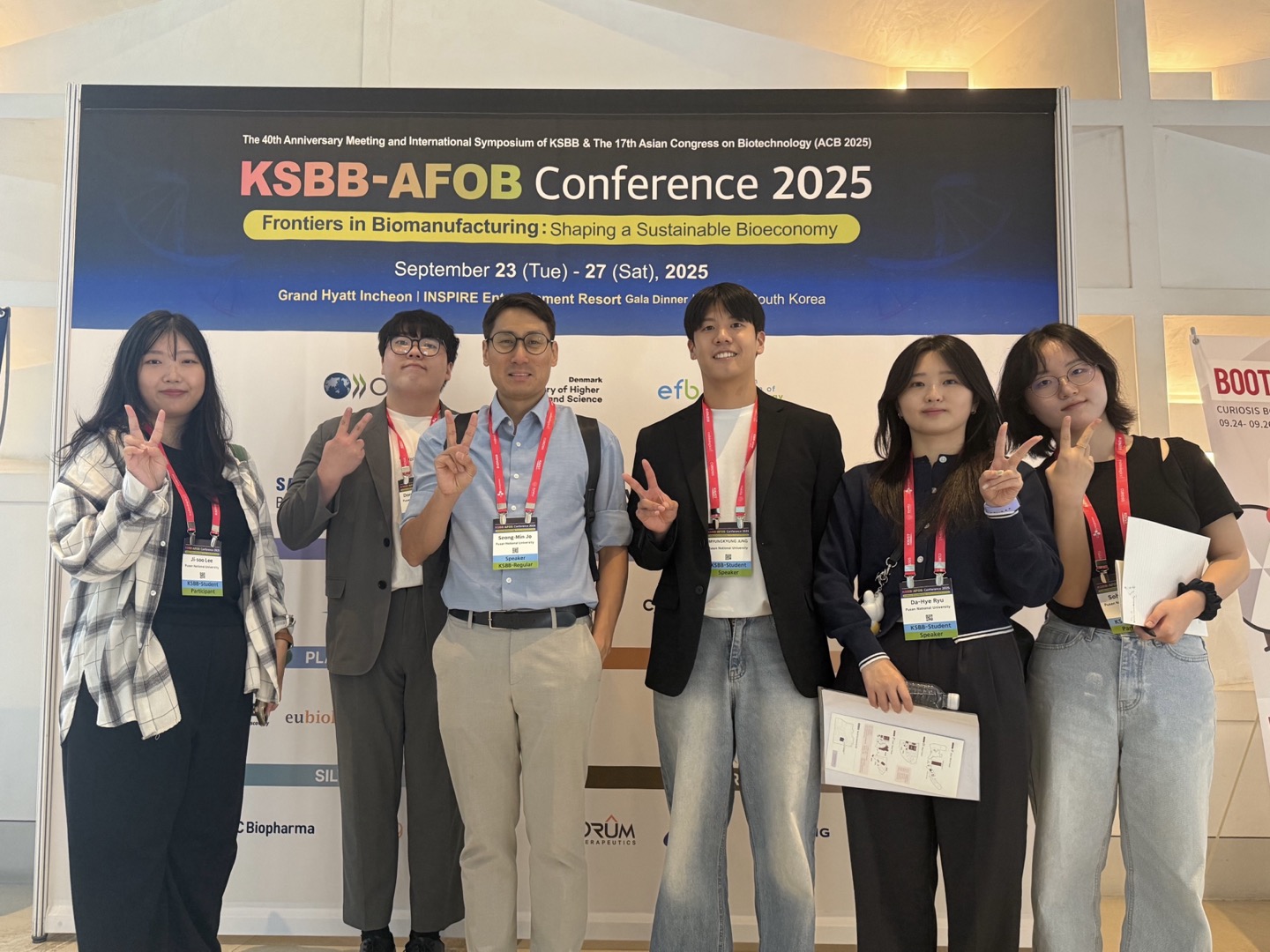 바이오소재과학과 나노인공세포공학실험실에서는 한국생물공학회(KSBB)와 아시아생물공학연합체(AFOB)가 공동 주최한 2025 추계 국제학술대회에 참석하여 연구결과를 발표하였고, 이지수 학생은 3분스피치 및 포스터 발표 부문에서 우수발표상을 수상하였습니다.